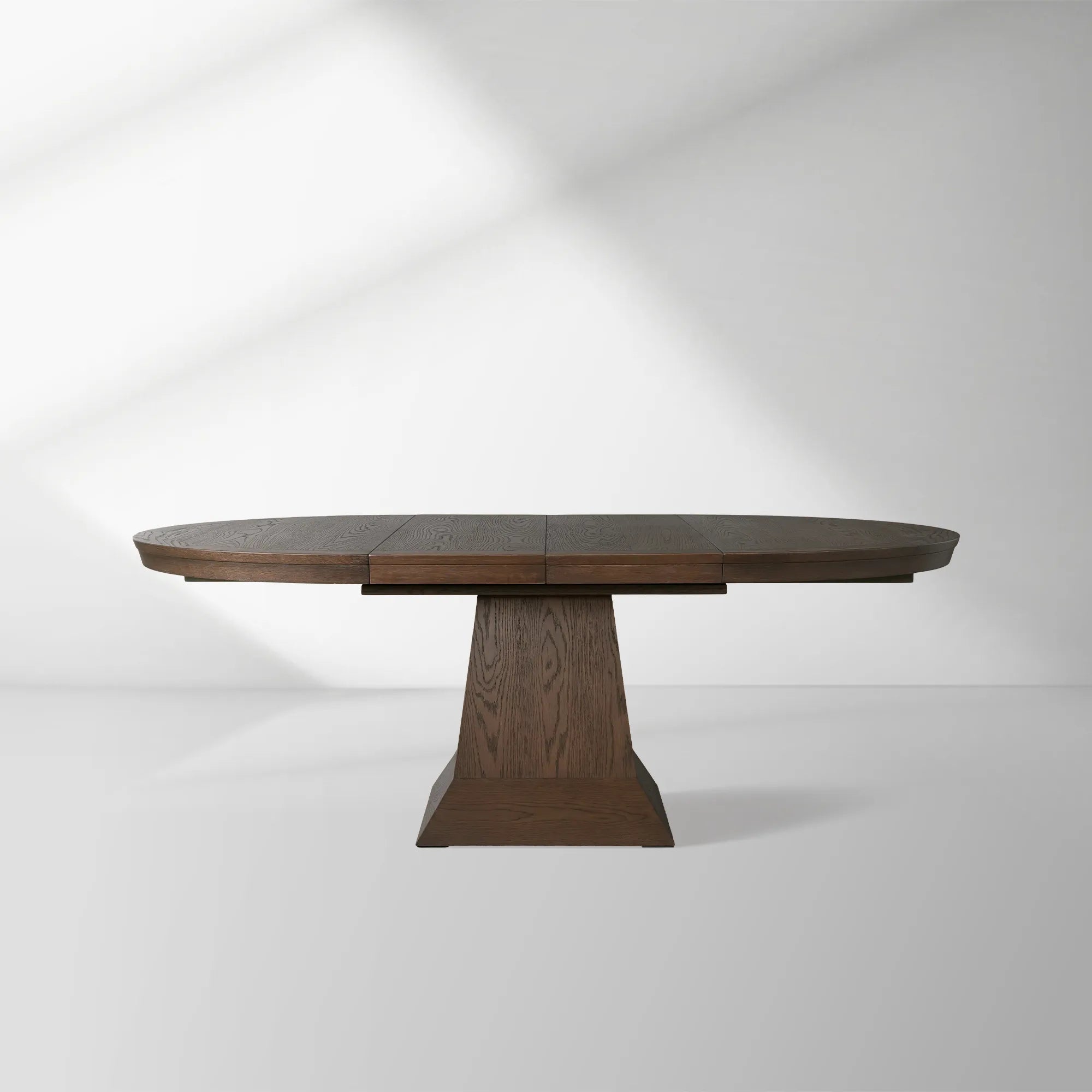 Gather in style and comfort around the Leighton Round Extension Dining Table. Expertly handcrafted with a timeless transitional pedestal base, this table is a testament to artisanal quality. Its exclusive rack-and-pinion extension mechanism operates with smooth precision, allowing you to seamlessly incorporate two included leaves and create abundant space for all of life's cherished gatherings.