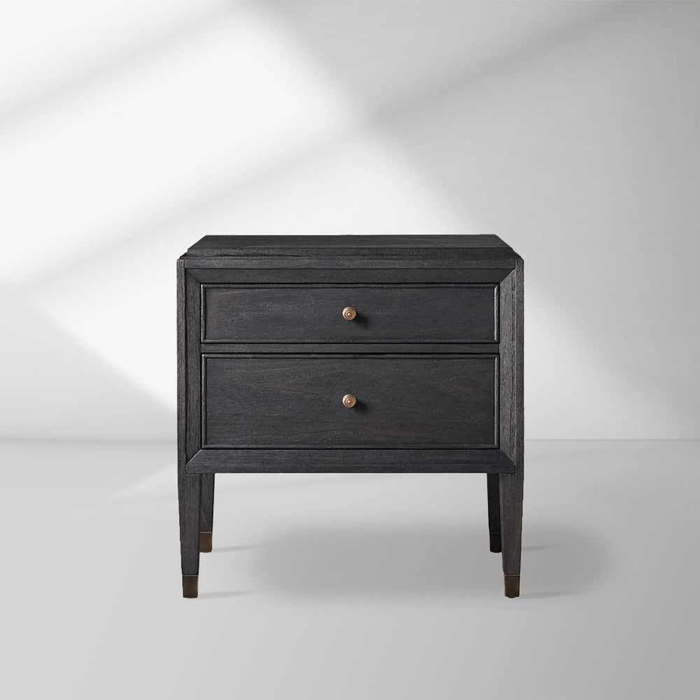 Crafted from solid mindi wood and veneers in your choice of Boulder Grey or Ebony finishes, the Lenox Nightstand features a rich, hand-applied finish that resembles a true work of art. The case is designed with three spacious drawers equipped with modern soft-closing, under-mounted glides, ensuring silent operation while maintaining the piece's vintage aesthetic. Standing at an impressive 30 inches tall, this nightstand makes a dramatic statement in any bedroom while providing ample storage space for your essentials.