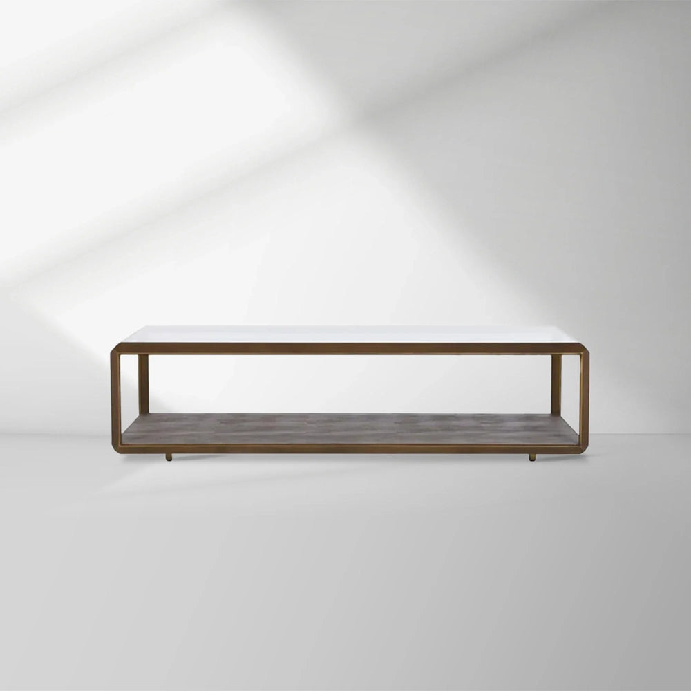 Effortlessly blending glamour and airy sophistication, the Max Rectangular Glass Coffee Table features a sleek, angular metal frame in antique brass, elegantly accented with textured faux shagreen. Its slender silhouette and transparent tempered glass top create an open, reflective presence that enhances light and space in any living area.