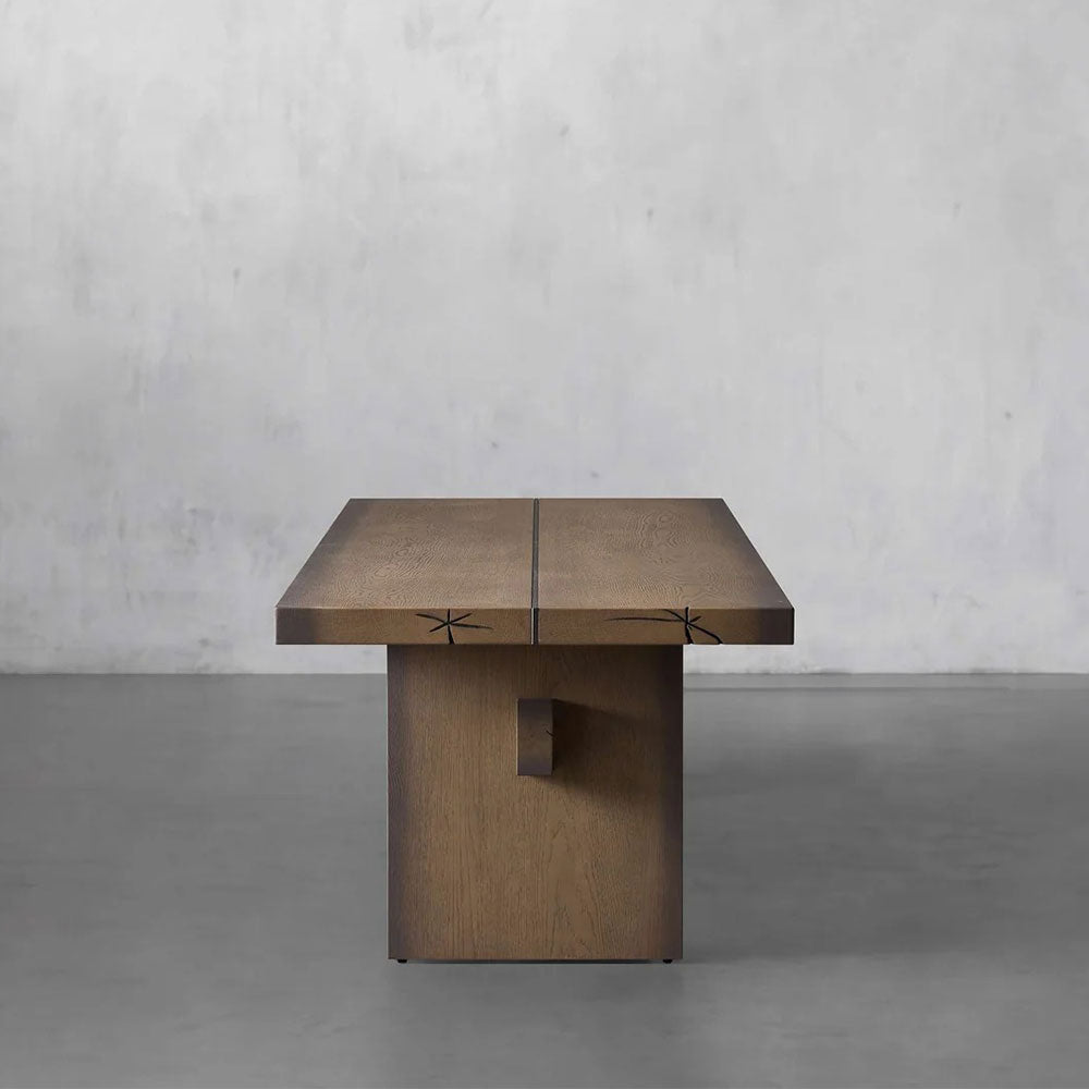 Experience the rich heritage and artisanal legacy of the Mihaela Dining Table, where centuries-old Romanian craftsmanship meets inspired design. Drawing inspiration from the stained interiors of aged wine barrels, this exceptional table showcases the natural beauty of sustainably harvested Romanian oak, hand-cut by local artisans from trees up to 250 years old in the mountain foothills of their village.