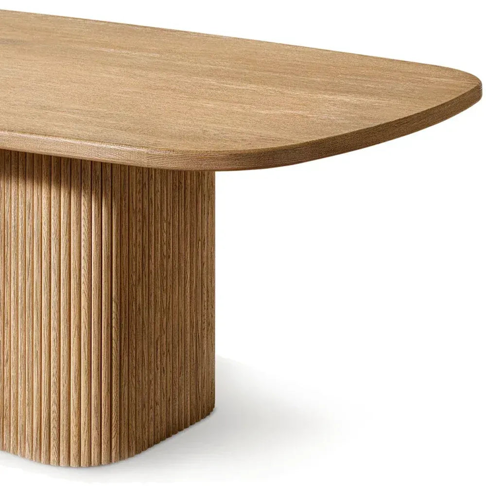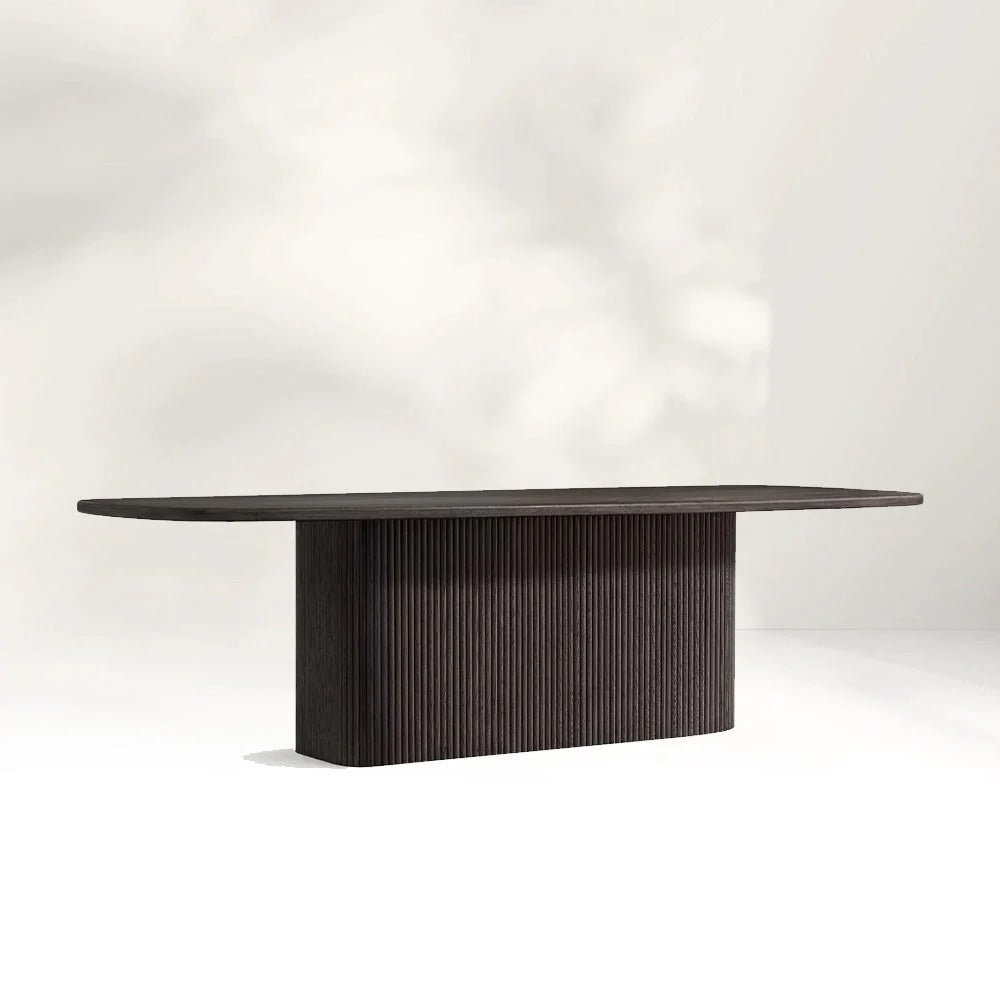 Designed by Thomas Bina and Ronald Sasson, the Mulho Pedestal Rectangular Dining Table blends organic texture and modern craftsmanship. Its distinctive base features hand-finished solid American oak reeds, wire-brushed to highlight the wood’s natural grain, while radius corners create a fluid, sculptural silhouette. Ideal for spacious dining areas, this table offers both visual impact and lasting resilience.