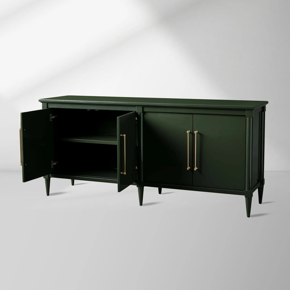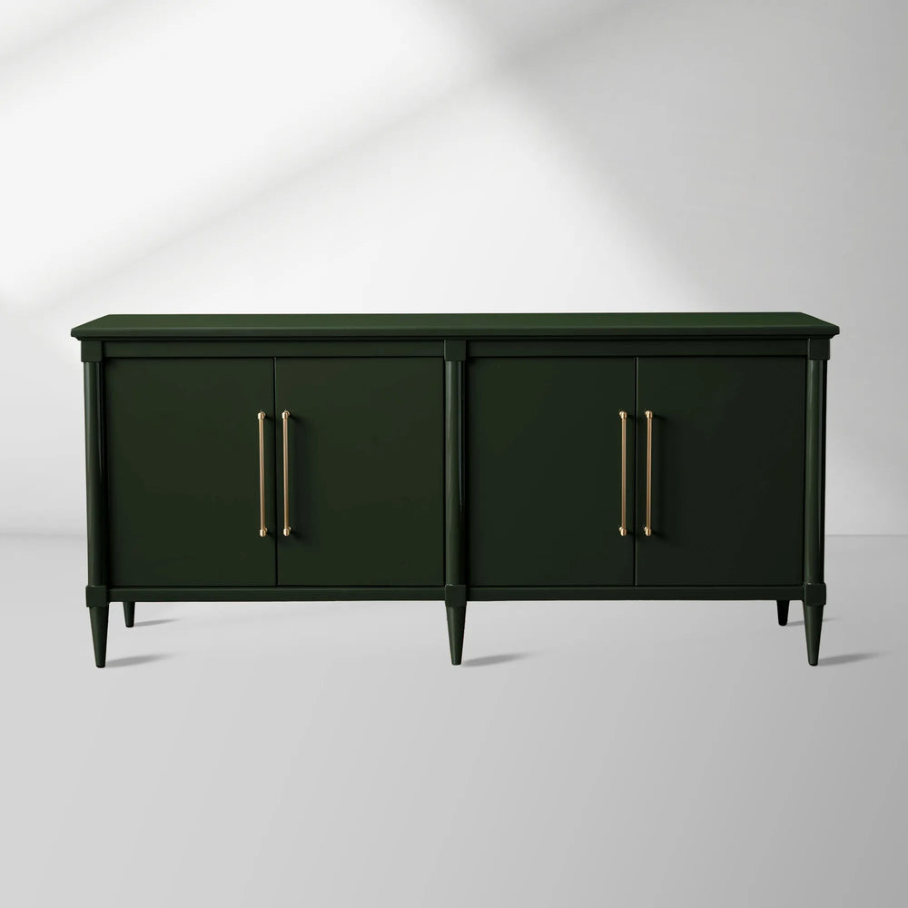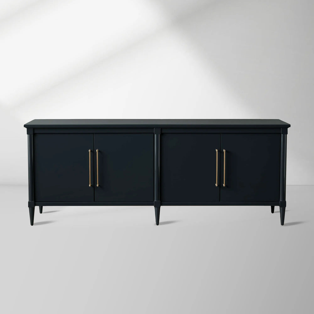 Embodying the opulent spirit of old Hollywood with a distinctly modern sensibility, the Oakleigh High-Gloss Sideboard makes a dramatic statement in any space. Meticulously handcrafted from solid poplar and beech wood, its architectural form is finished with a brilliant, glass-like lacquer that catches the light and elevates the room. Rich color tones, refined reeded detailing, and gleaming brass hardware complete a look that is both timeless and sophisticated.