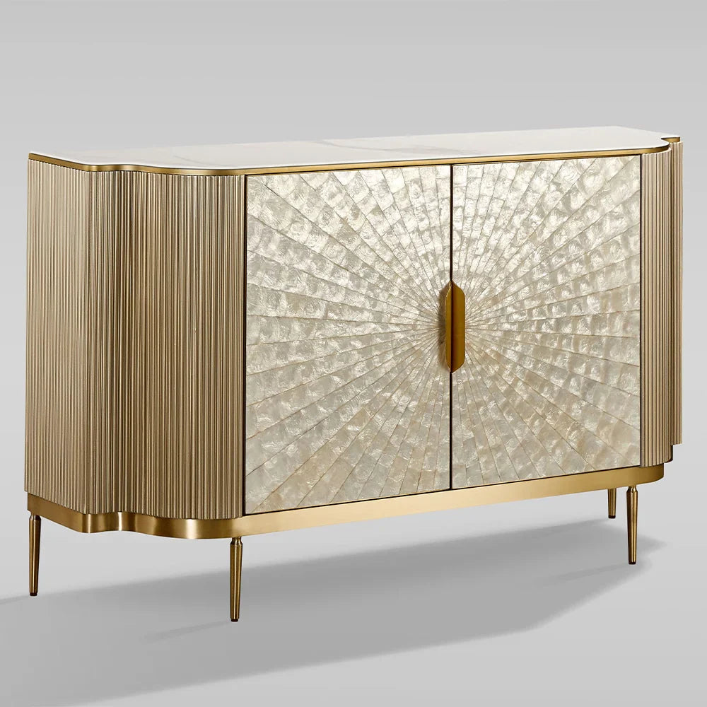 Embrace coastal-inspired luxury with the Perla Two-Door Cabinet Sideboard, where organic elegance meets contemporary design. This exquisite piece features hand-laid natural mother-of-pearl inlay on each door panel, creating a captivating iridescent effect that shifts with the light. Topped with genuine slate stone and framed by sensually curved wings hand-painted in soft champagne-gold tones, the sideboard is both a visual and tactile delight. Brushed stainless steel legs, handles, and frame in a warm metallic gold finish complete its sophisticated presence.