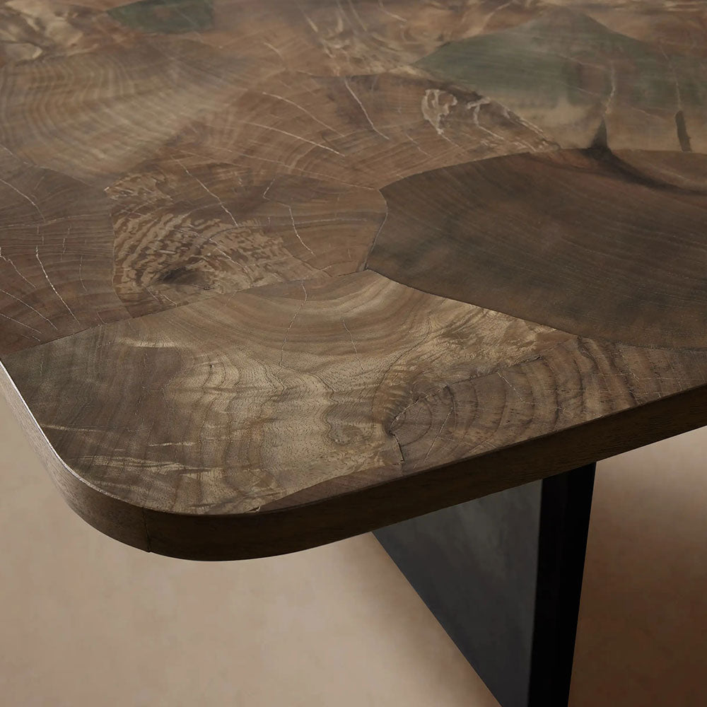 Born from nature’s resilience and artisan vision, the Polanco Dining Table tells a story of renewal and rustic elegance. After heavy storms, fallen Mexican ash trees are salvaged by artisan partners in Mexico, then oyster-cut and arranged by hand alongside sustainably grown European ash burl fragments. The resulting mosaic tabletop—rich in texture and tonal depth—is paired with a naturally oxidized steel base, whose speckled patina evolves beautifully over time.