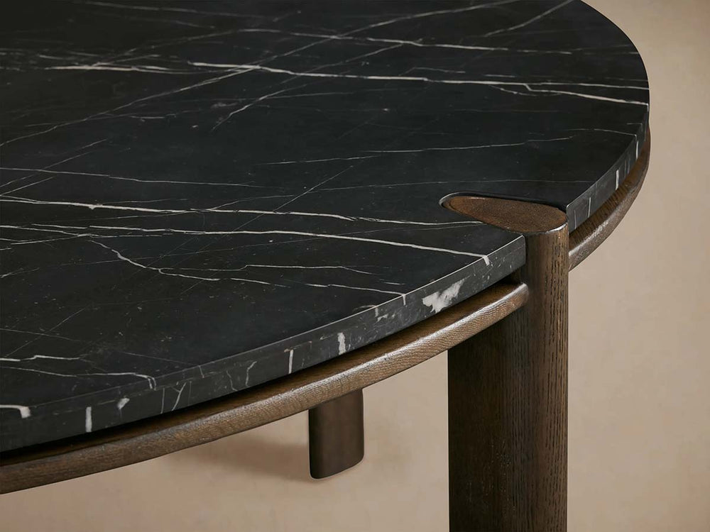Each component reflects masterful artistry: the stone top is secured with reinforced engineered hardwood joinery for lasting stability, while the oak base is hand-stained and finished with a protective lacquer that enhances the wood's natural grain. As both stone and wood are natural materials, your Pyet table will display unique veining, mineral patterns, knots, or subtle texture variations—beautiful marks of authenticity that tell its unique story.