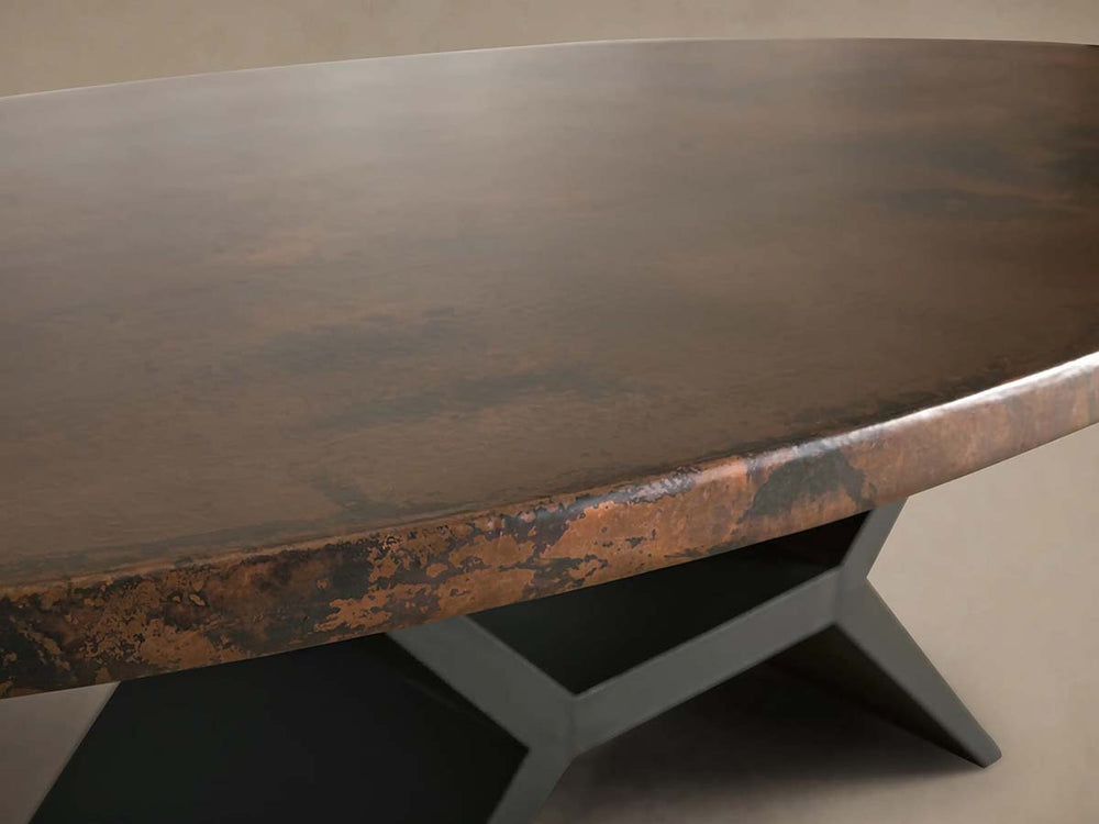 Each tabletop is treated with two layers of protective lacquer and accented by the Vertex Base—crafted from iron in a subtle flat black finish to elegantly frame the metal above. To honor its transformation, our artisans hand-stamp a monarch butterfly along the table’s edge, symbolizing renewal and artisan pride.