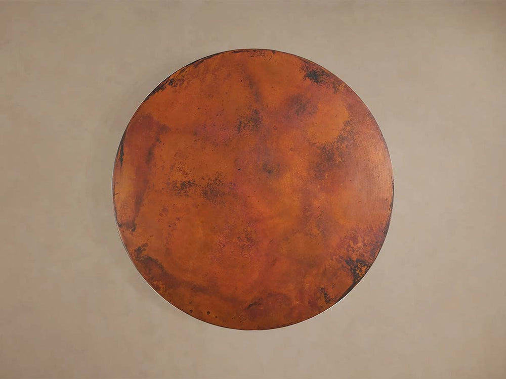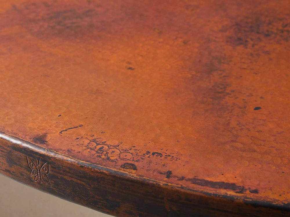 Each table tells a story of transformation—from discarded metal to functional art. In a Mexican village visited annually by monarch butterflies, master metalworkers hand-hammer recycled sheets over hardwood more than 3,500 times, creating richly textured surfaces unique to your table. Finished over open flame to develop organic patinas and sealed with two protective lacquer layers, these tabletops are available in: