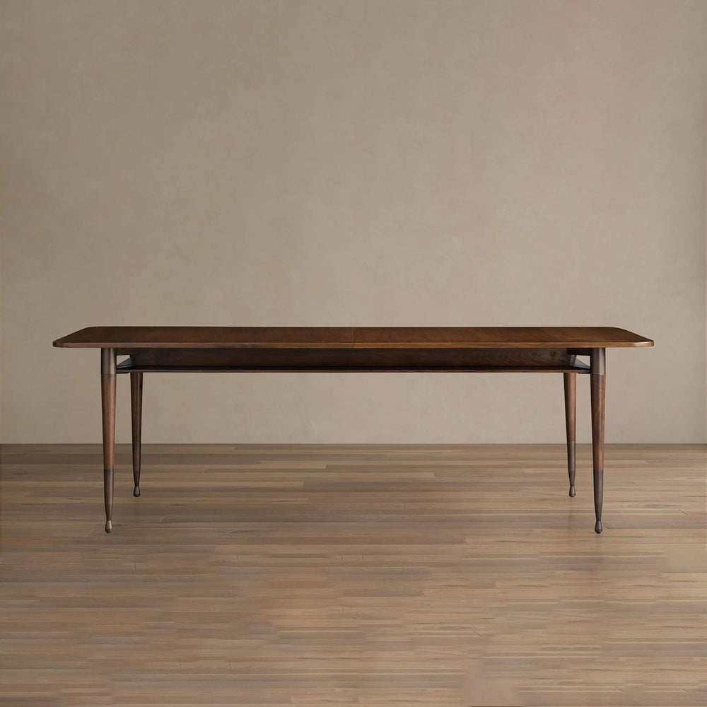 rawing inspiration from vintage mid-century design, the Ross Extension Dining Table combines timeless elegance with thoughtful functionality. Its refined details—from the gracefully tapered legs and patinaed brass caps to the warm walnut finish and softly rounded edges—bring a touch of understated sophistication to any dining or living space.