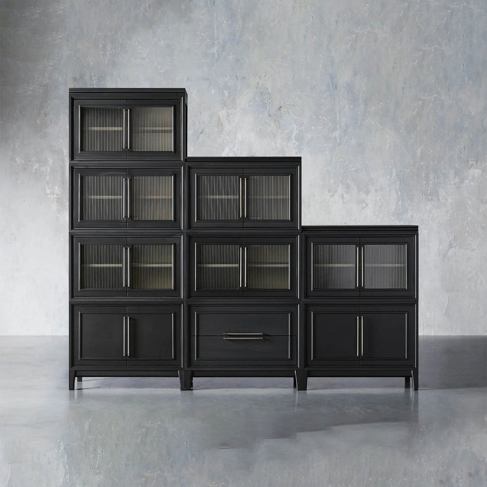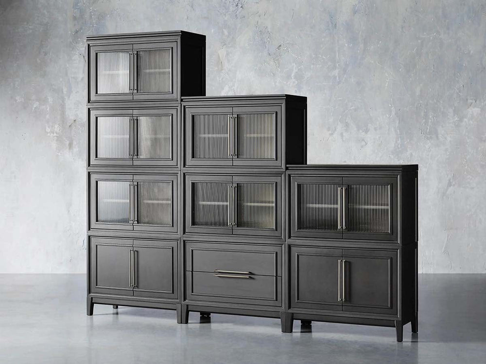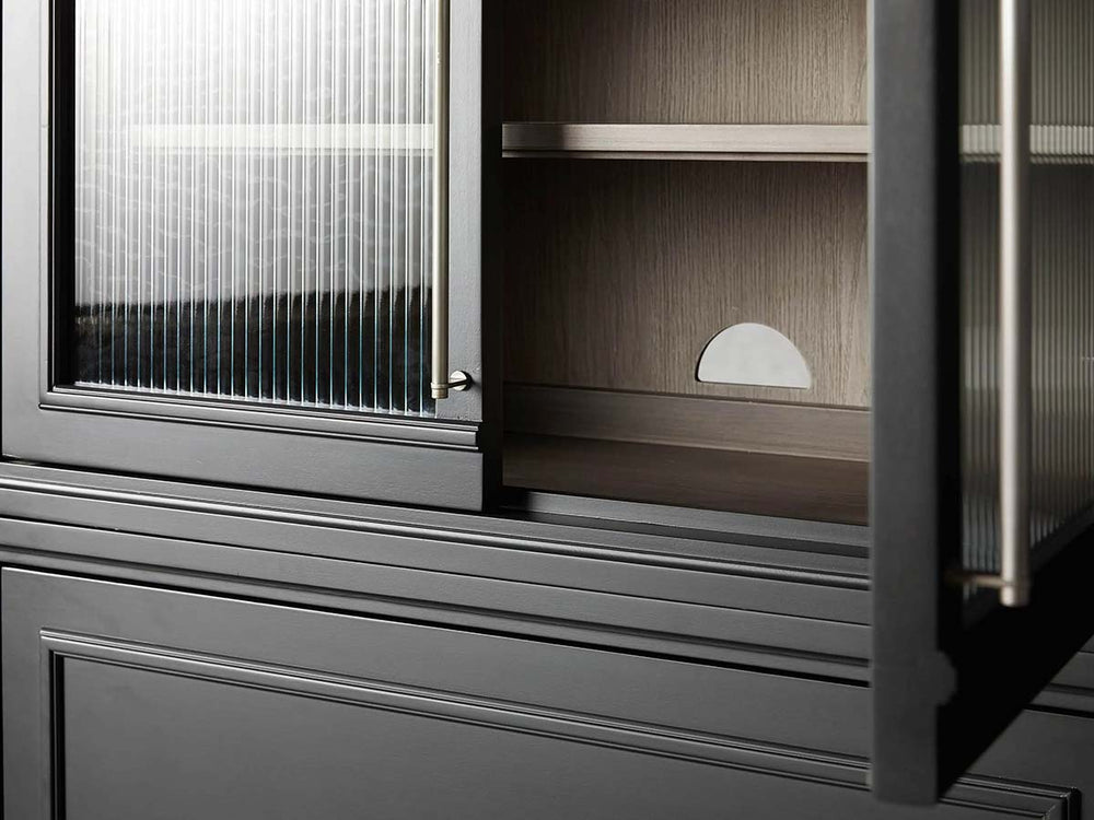 The collection showcases elegant reeded glass doors that create subtle texture and soft visual privacy, while iron hardware in brass or pewter tones adds refined contrast. Inside, ash-veneered interiors and adjustable shelving provide flexible storage, complemented by integrated cord management for electronics.
