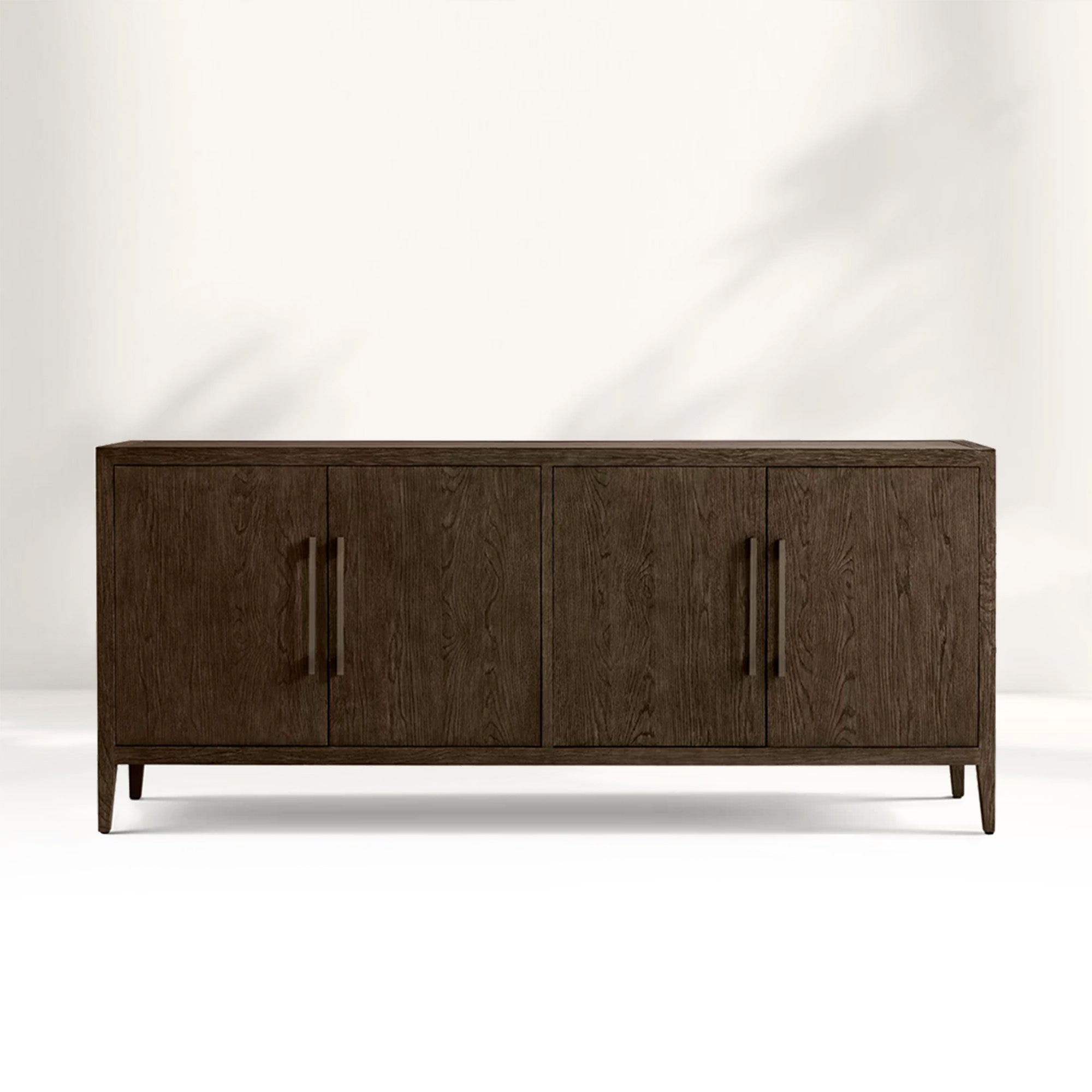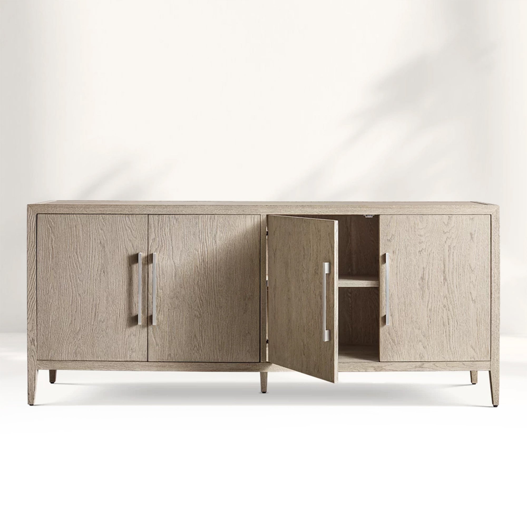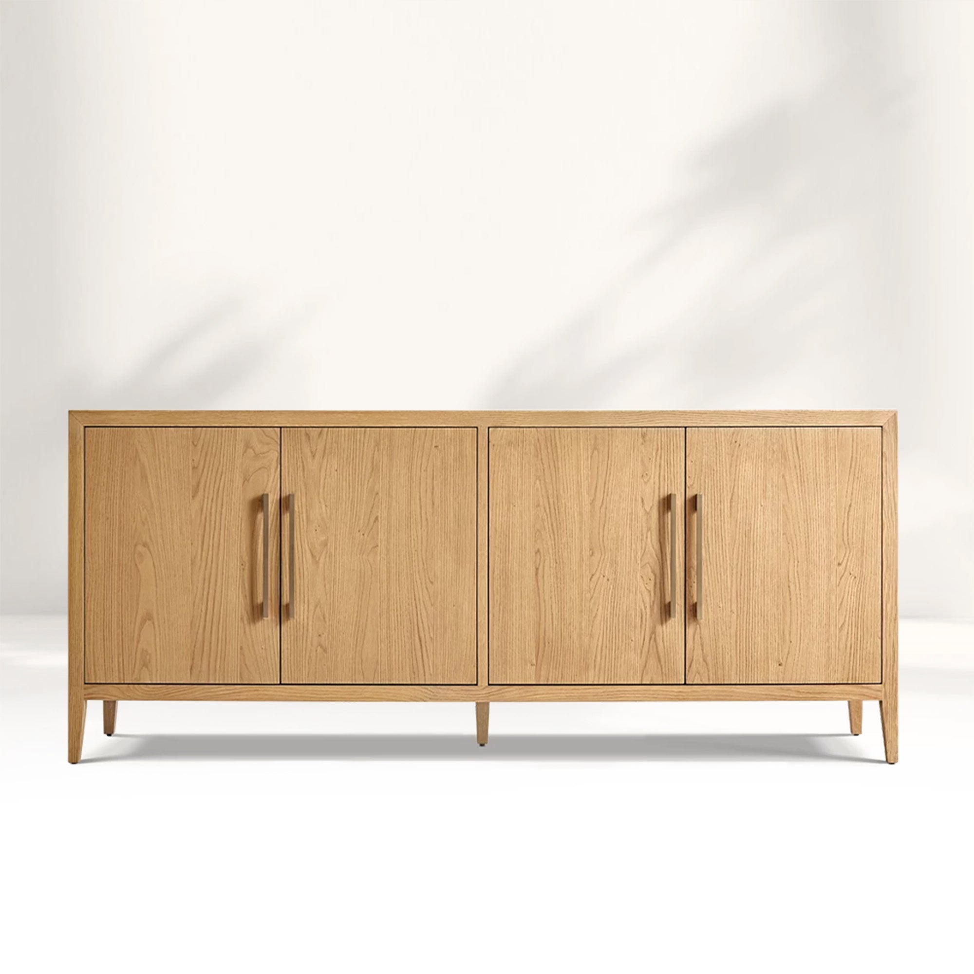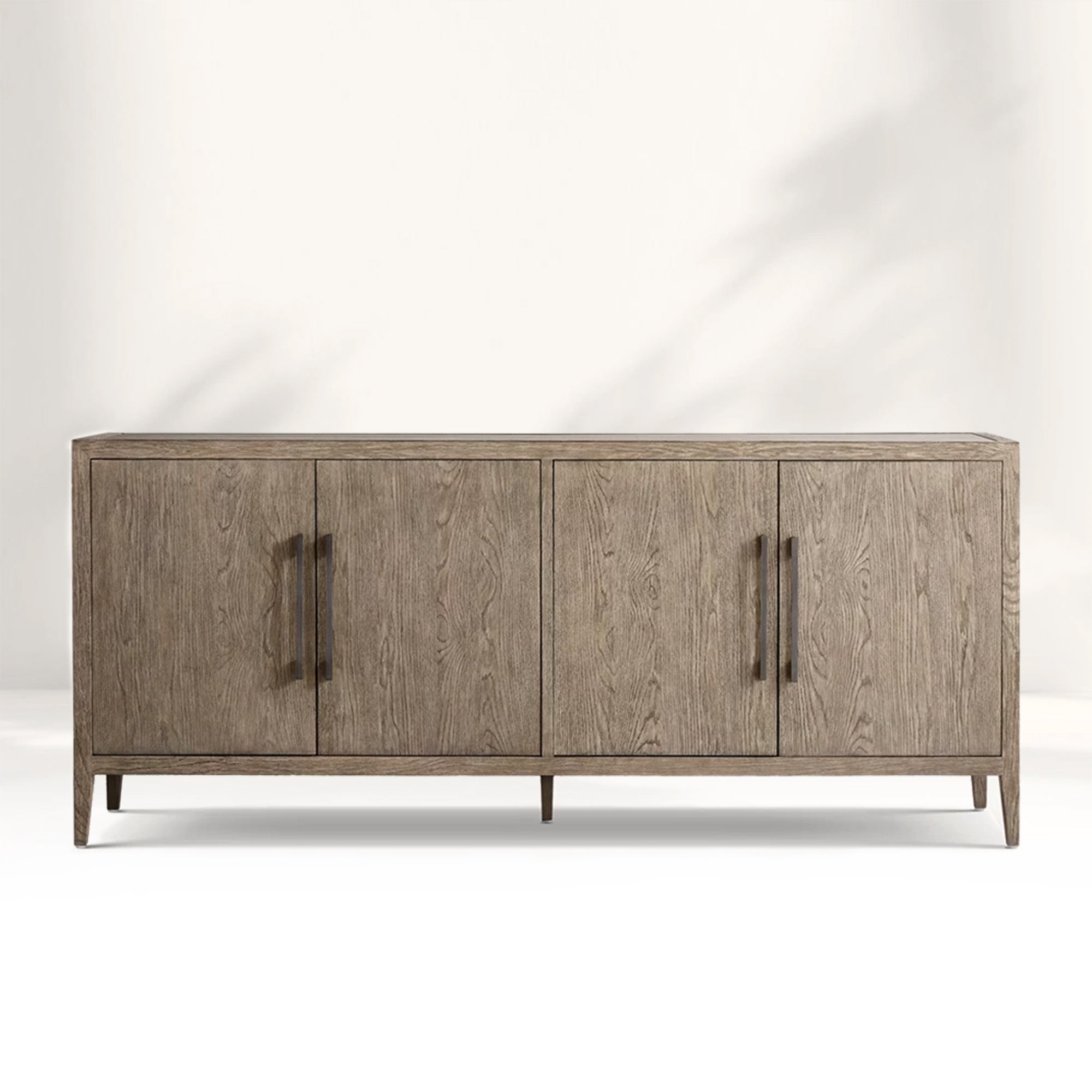 Embodying a harmonious blend of French elegance and modern minimalism, the Ryze 4-Door Sideboard celebrates the pure beauty of natural wood through clean lines and organic texture. Meticulously handcrafted from kiln-dried solid American white oak and oak veneers, this sideboard features a soft sandblasted finish that enhances the wood’s rich grain while adding subtle tactile depth. The streamlined silhouette and understated solid zinc hardware allow the material’s authentic character to shine, creating a timeless and serene presence in any interior.