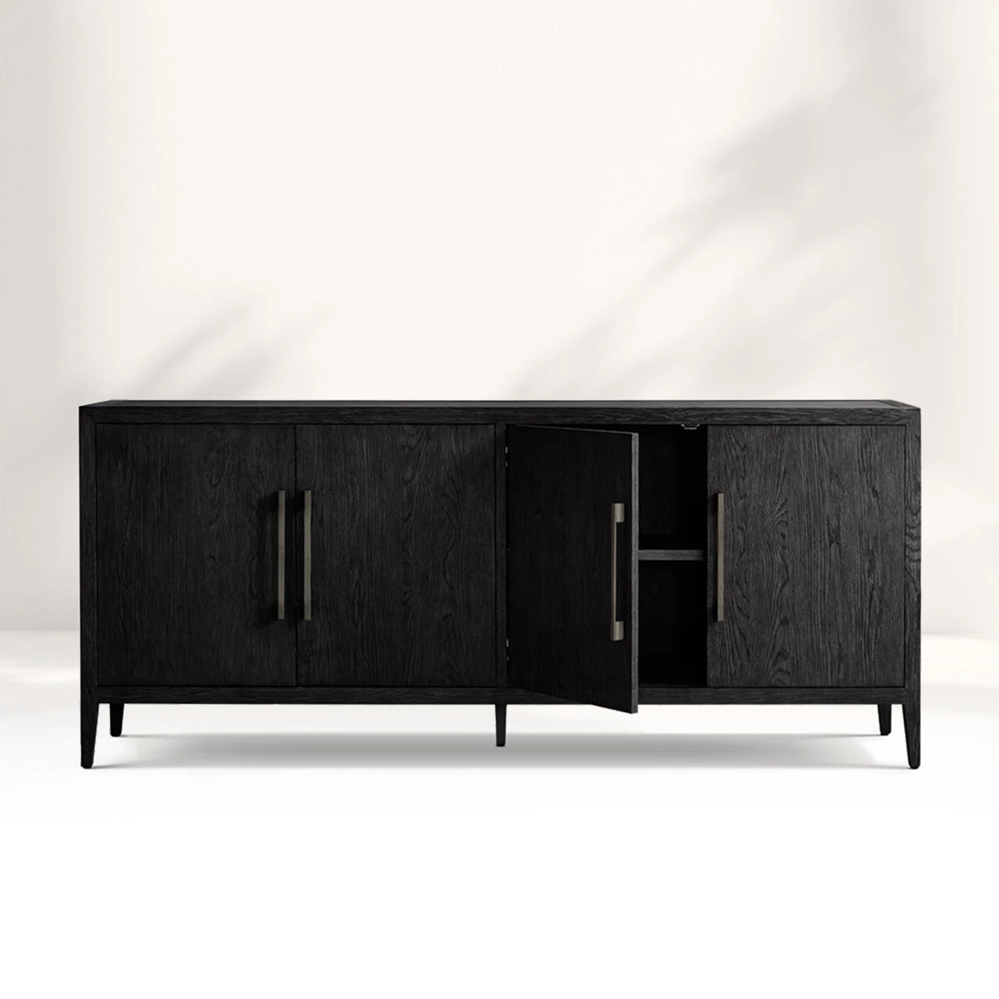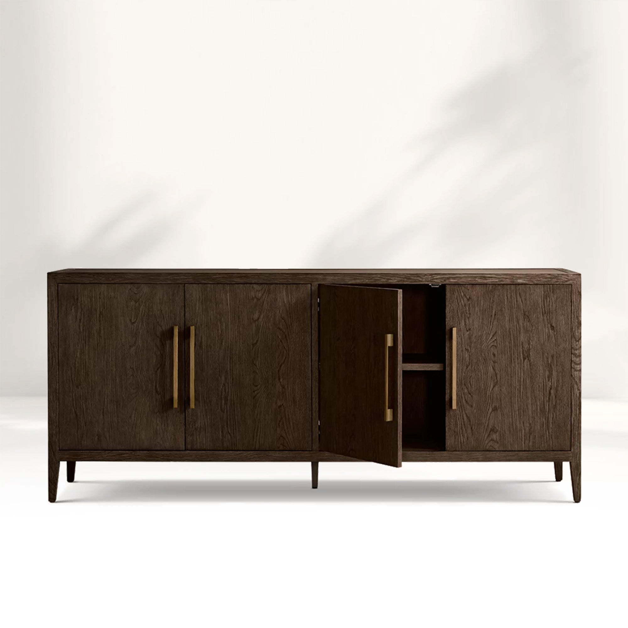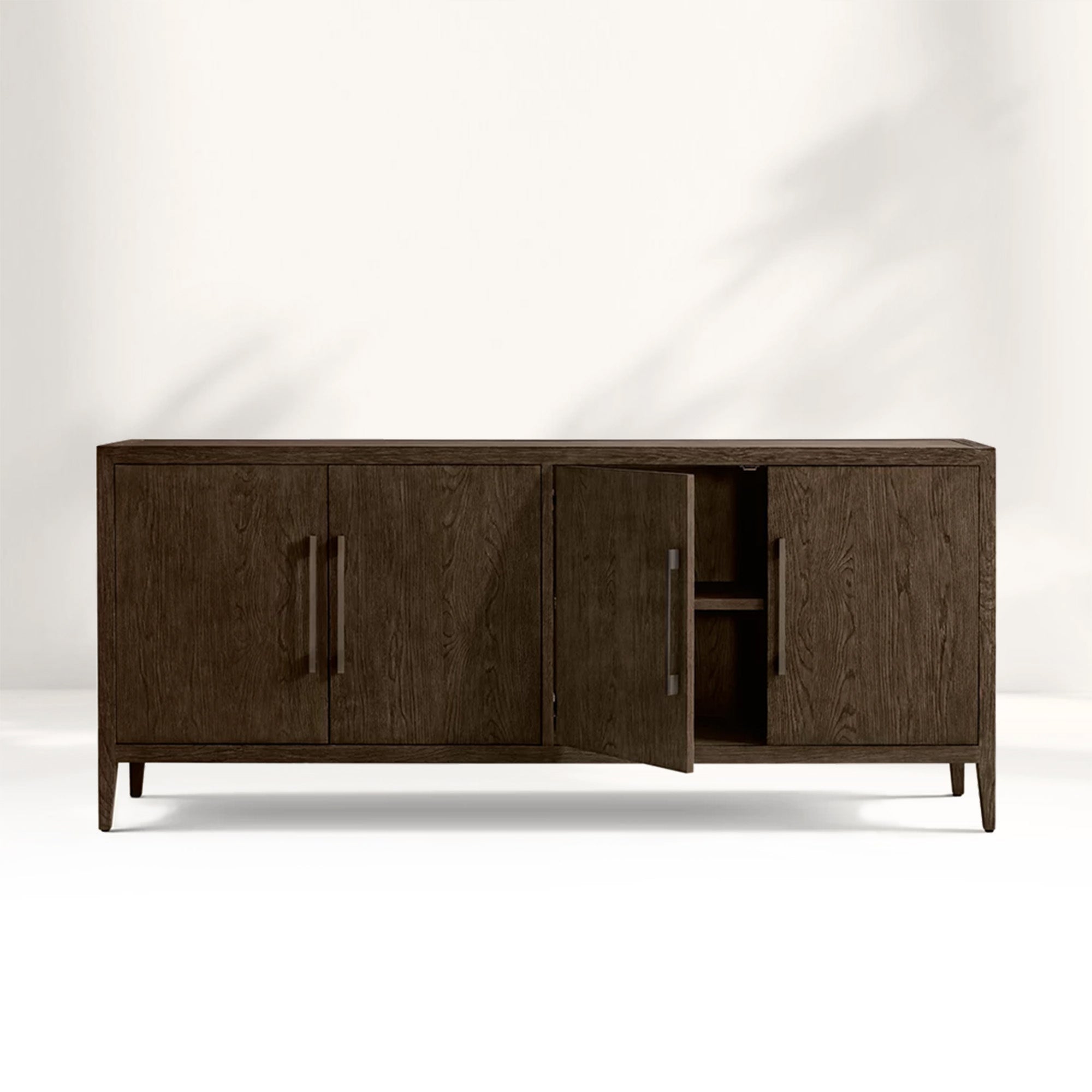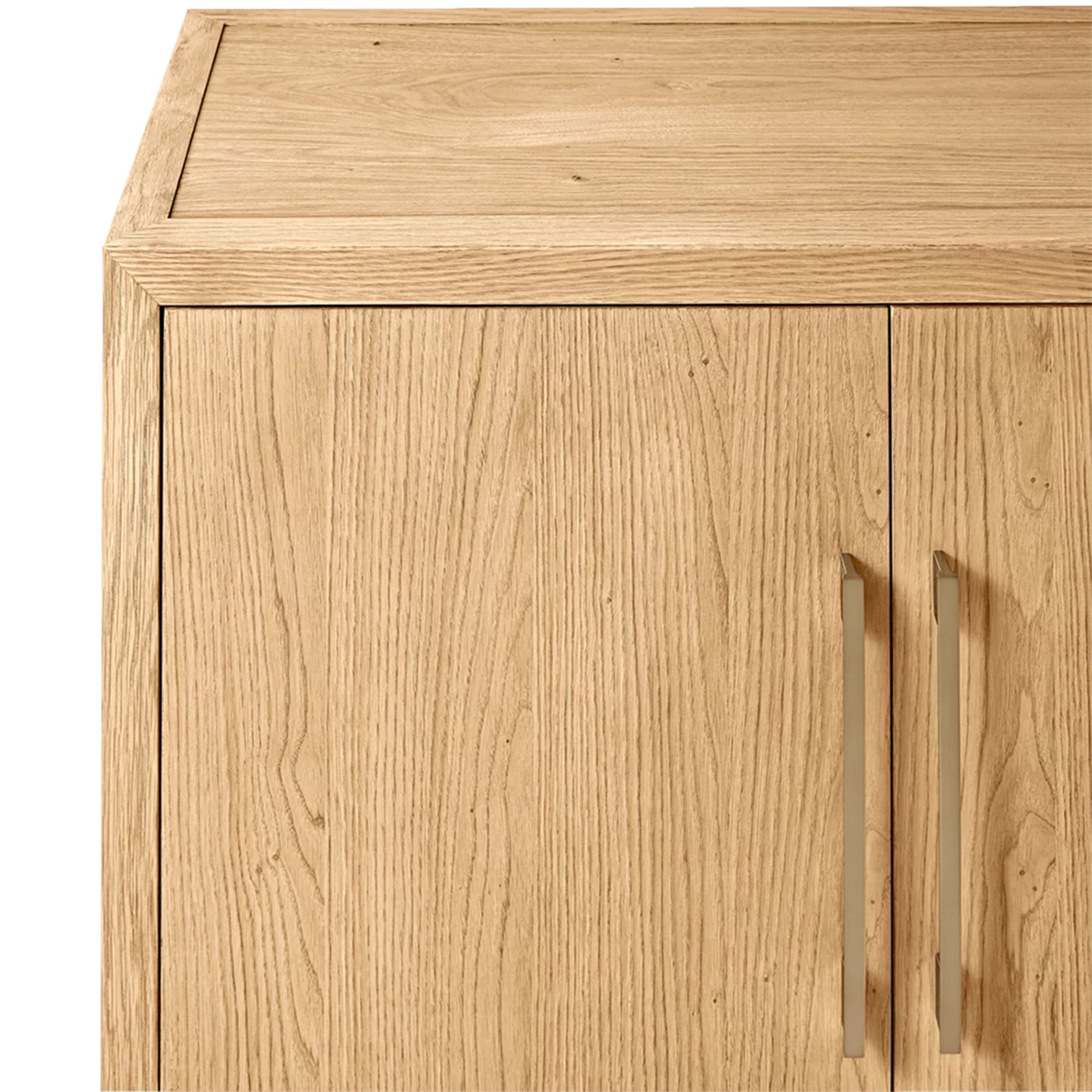 Embodying a harmonious blend of French elegance and modern minimalism, the Ryze 4-Door Sideboard celebrates the pure beauty of natural wood through clean lines and organic texture. Meticulously handcrafted from kiln-dried solid American white oak and oak veneers, this sideboard features a soft sandblasted finish that enhances the wood’s rich grain while adding subtle tactile depth. The streamlined silhouette and understated solid zinc hardware allow the material’s authentic character to shine, creating a timeless and serene presence in any interior.