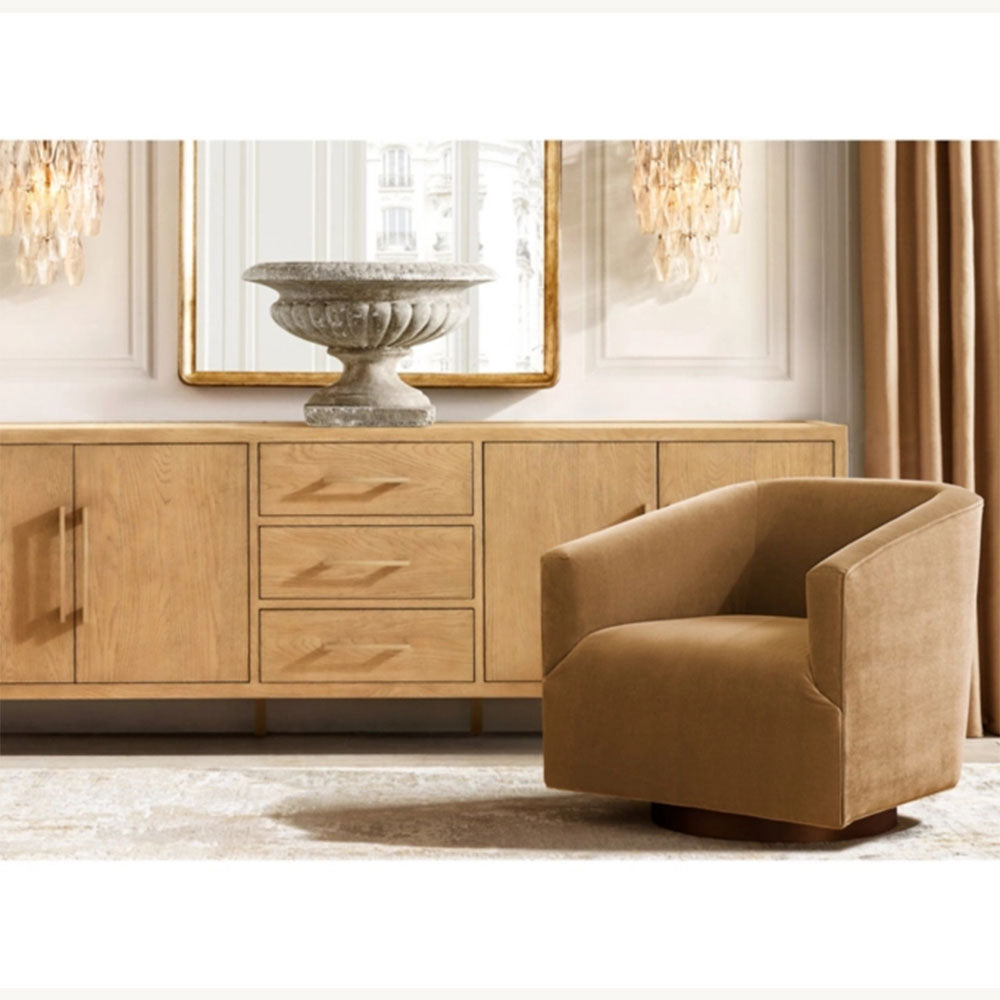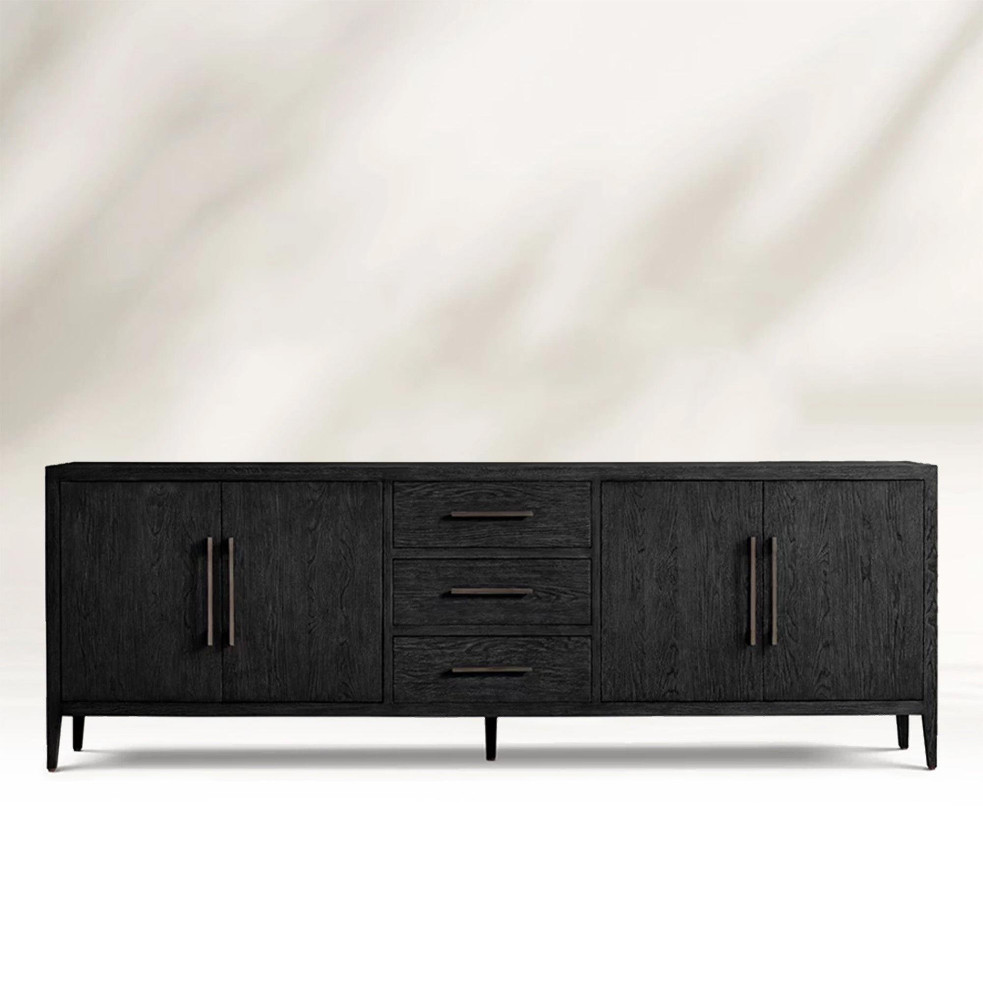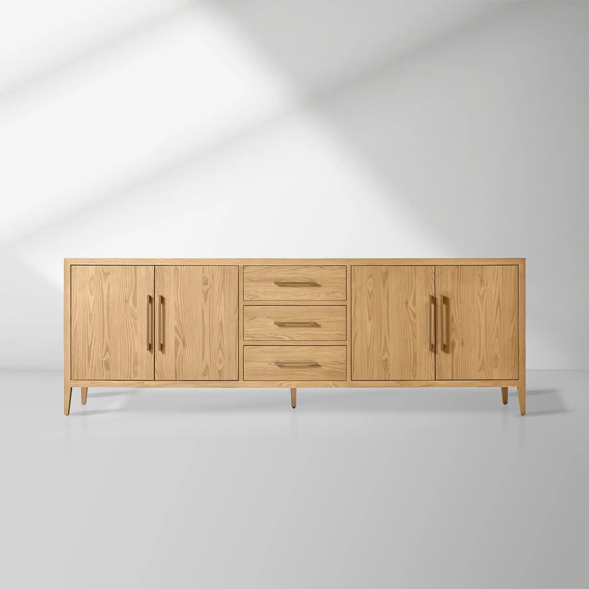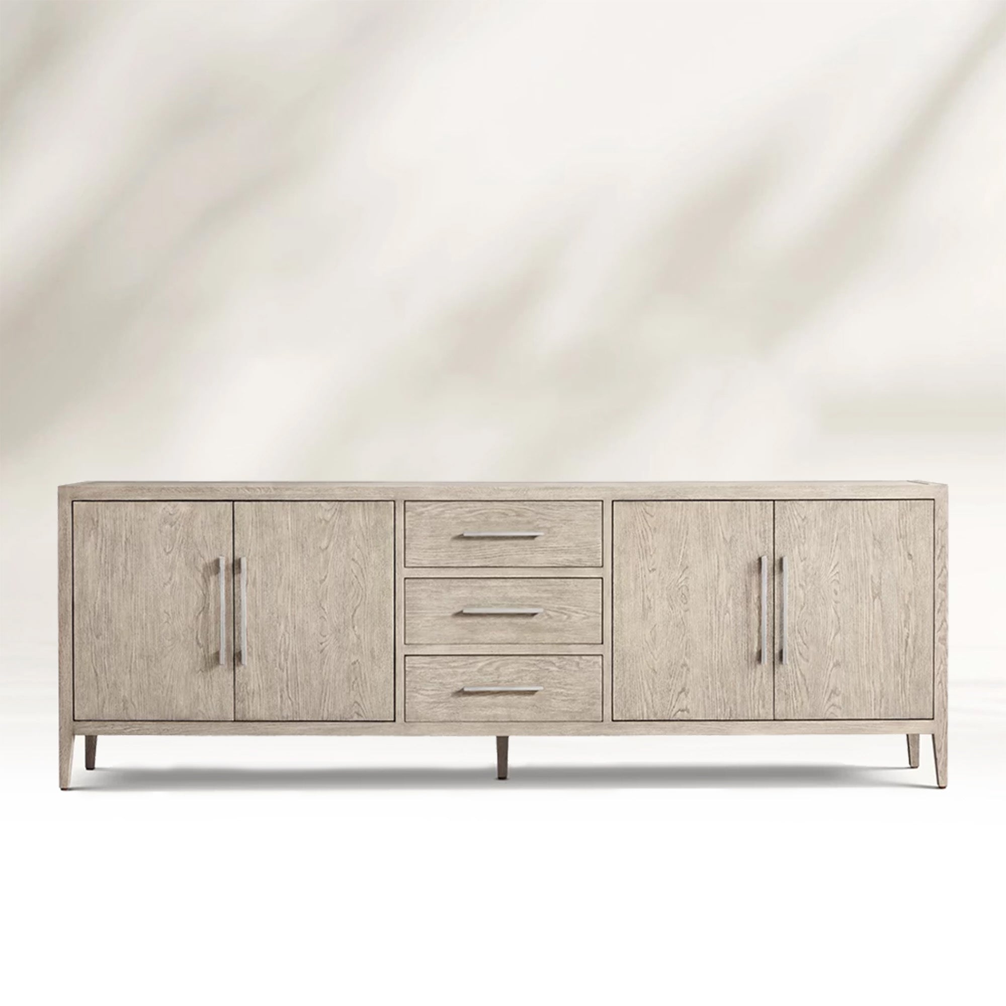 Embodying the harmonious balance between organic purity and French-inspired elegance, the Ryze 4-Door Sideboard with Drawers showcases the natural beauty of American white oak through minimalist design and refined craftsmanship. Expertly handcrafted from kiln-dried solid oak and oak veneers, this wide-format piece features a soft sandblasted finish that enhances the wood’s rich grain while adding subtle texture. The clean, flowing lines and understated solid zinc hardware create a timeless silhouette suited for spacious dining, living, or lounge areas.