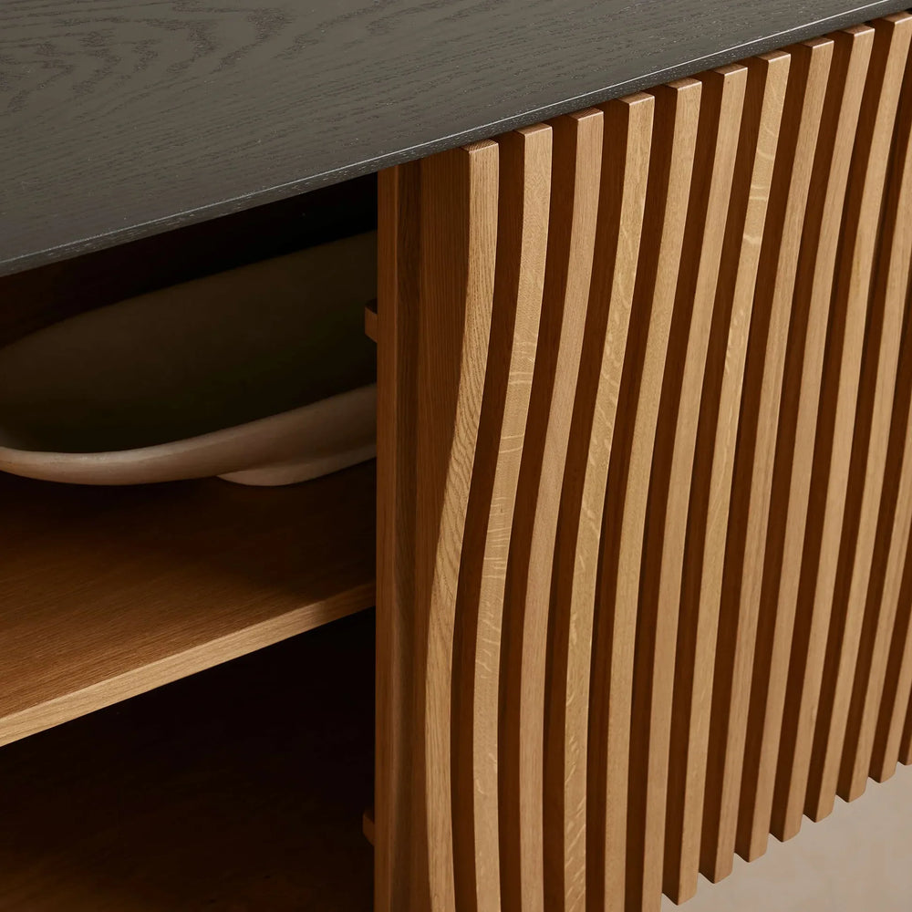 The Sorin Sideboard masterfully blends architectural presence with artisanal warmth. Handcrafted in Romania, it features a striking two-toned palette and unique oversized reeded detailing with a gentle wave-like variation, finished by hand in a soft honey tone. With its spacious interior concealed behind soft-close doors, this piece adds a layer of organic texture and functional elegance to any room it graces.