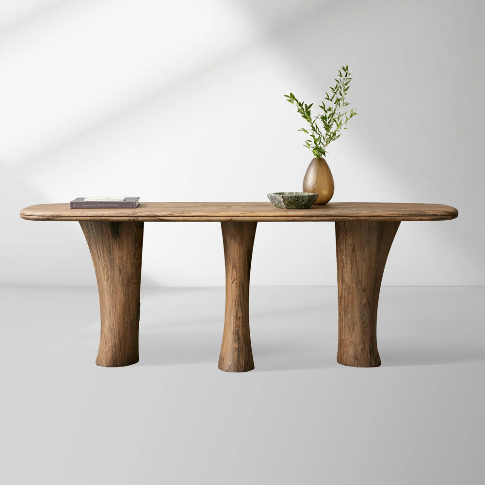 The Soumaya Console Table is a masterful expression of organic artistry, handcrafted in Mexico to embody the harmony between nature and refined design. Its captivating top features a radial arrangement of salvaged spalted primavera veneer, each piece showcasing unique grain patterns and natural markings. This free-form surface rests upon sturdy legs carved from solid Mexican mahogany, evoking the raw strength and texture of tree trunks to create a truly grounded, sculptural silhouette.