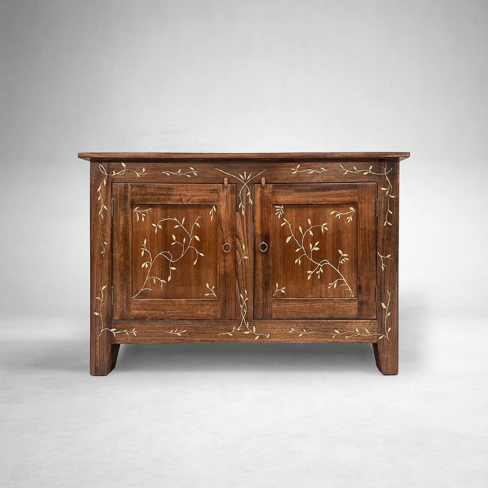 • **Hand-Painted Artistry:** Each buffet features unique, watercolor-style leafy florals painted directly onto the wood, ensuring no two pieces are alike.