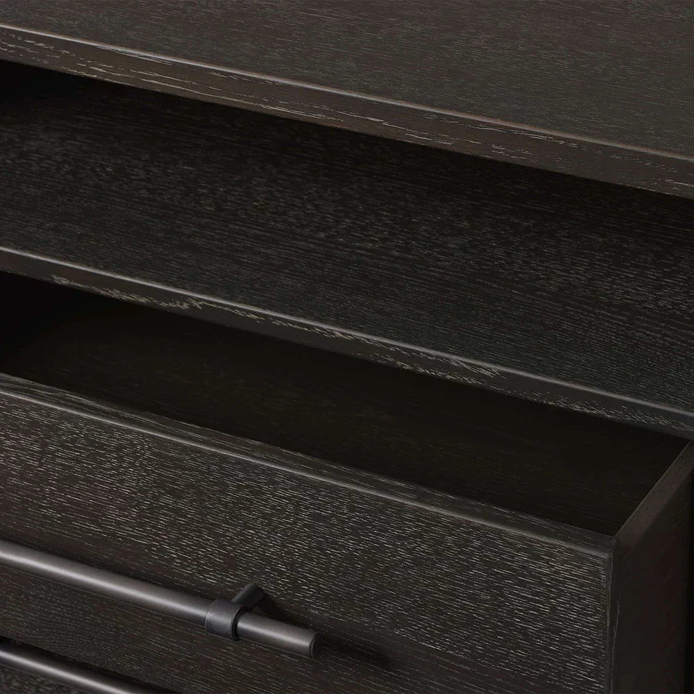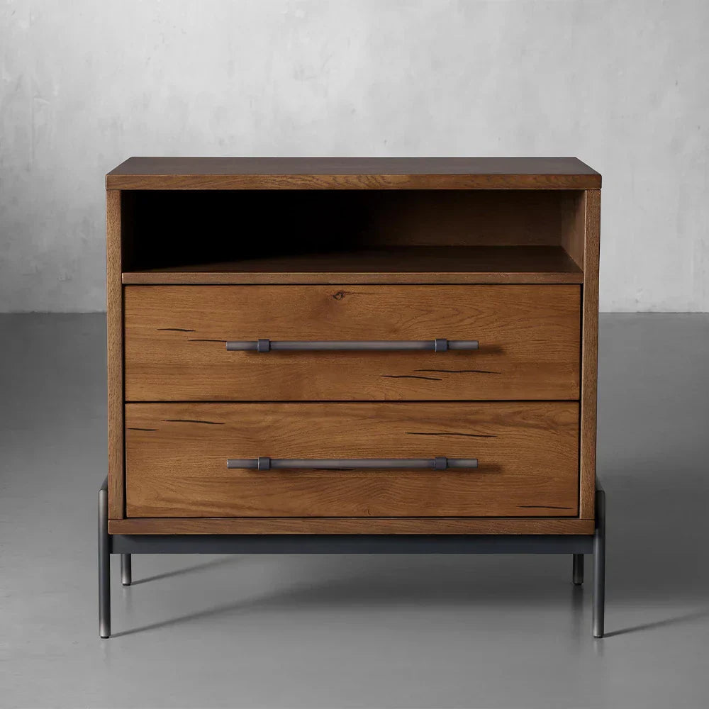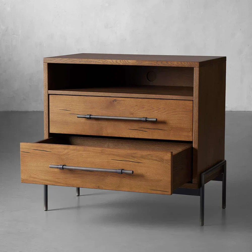 The nightstand combines practical storage with elegant details, featuring two soft-close drawers and an open shelf with integrated cord management for modern convenience. The sturdy iron base and hardware in a sophisticated Burnished Graphite finish provide a striking contrast to the warm wood tones, creating a grounded, organic aesthetic that enhances any bedroom space.