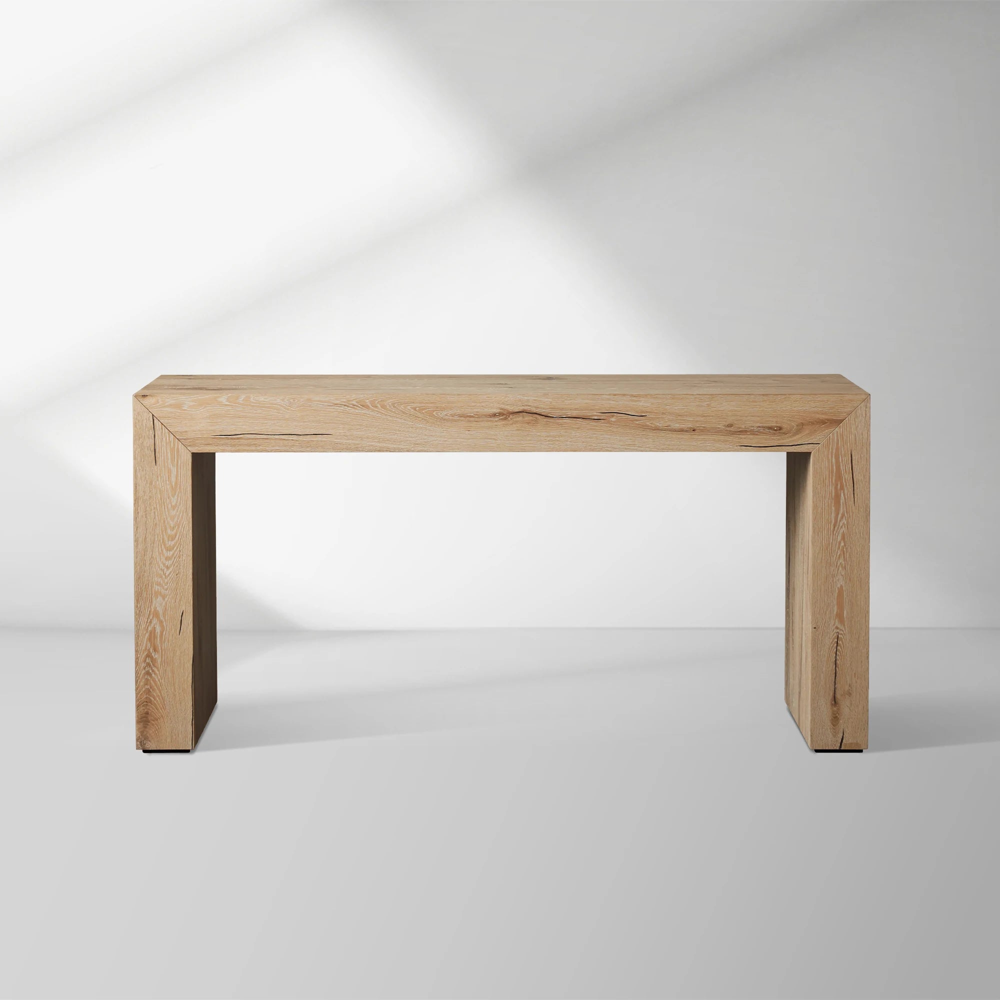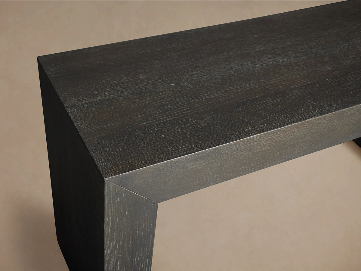 Defined by its graceful waterfall edges and grounded modern aesthetic, the Sullivan Console Table in the Northman finish blends sustainable craftsmanship with striking visual continuity. Meticulously built using reclaimed European oak and sustainably sourced new oak, each piece showcases a deeply layered, hand-stained glaze sealed in matte lacquer for enduring beauty.