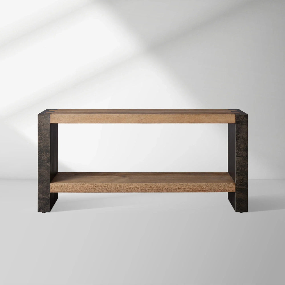 The Telluride Console Table unites the soul of reclaimed Mexican oak with the raw character of naturally oxidized steel. Each piece of deeply grained, sustainably harvested wood is carefully hand-lacquered to honor its organic texture and natural markings. The steel base is left to weather in the elements, developing a one-of-a-kind patina of dimples, speckles, and soft rust tones over time.