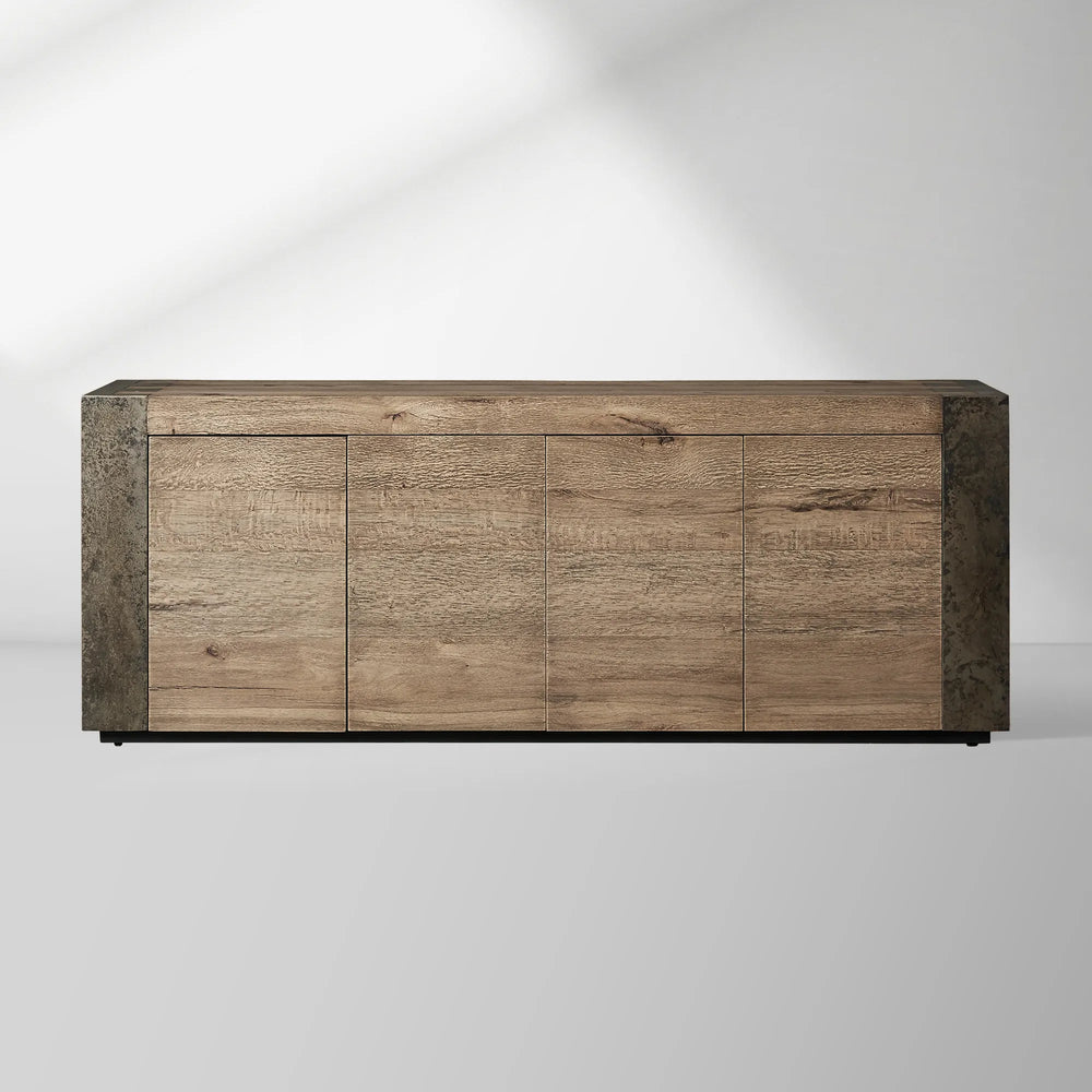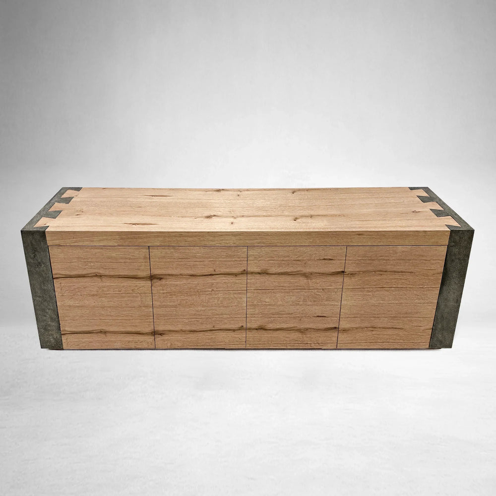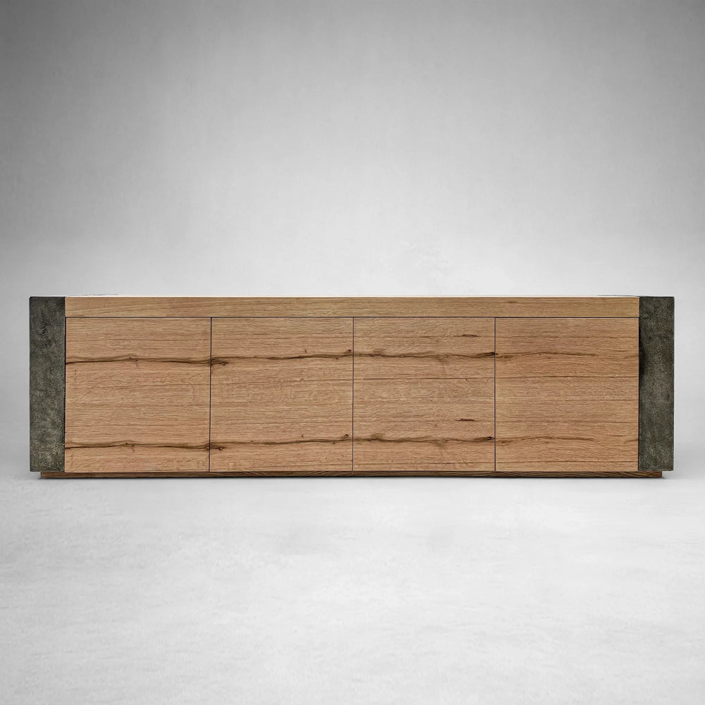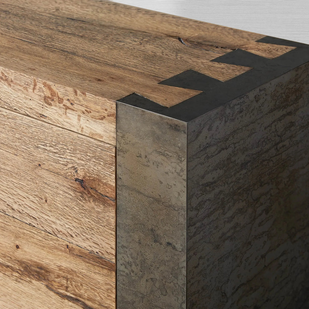 The Telluride Media Console tells a story of natural transformation through its union of reclaimed Mexican oak and naturally oxidized steel. Each piece is thoughtfully shaped by artisan hands—the oak is carefully lacquered to enhance its organic grain, while the steel is left to the elements, developing a one-of-a-kind patina marked by time. The result is a console rich in texture, character, and soul.