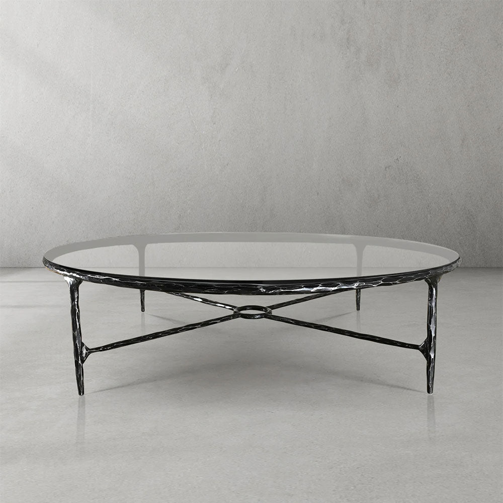 Blending rustic charm with modern elegance, the Thaddeus Coffee Table unites the raw beauty of hand-forged metal with the sleek transparency of tempered glass. Each table is crafted using time-honored techniques, with artisans meticulously hammering solid metal bars to create a distinctive, organic texture that celebrates imperfection. The bold, tapered metal frame offers a striking contrast to the refined, smooth surface of the honed glass top.