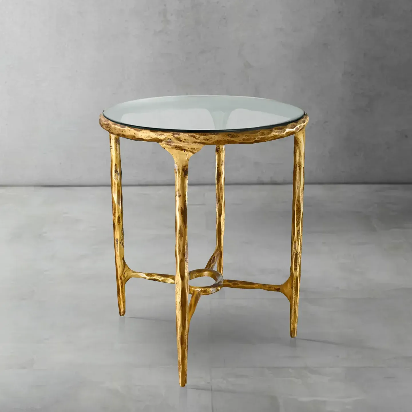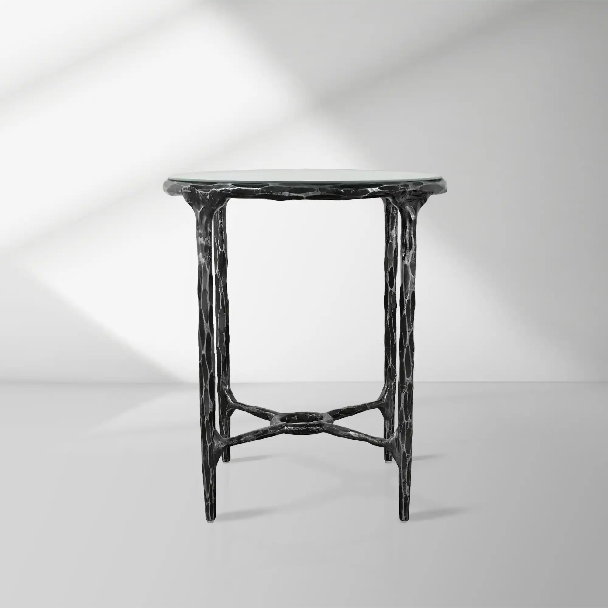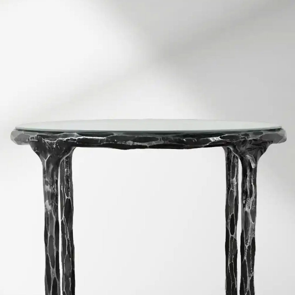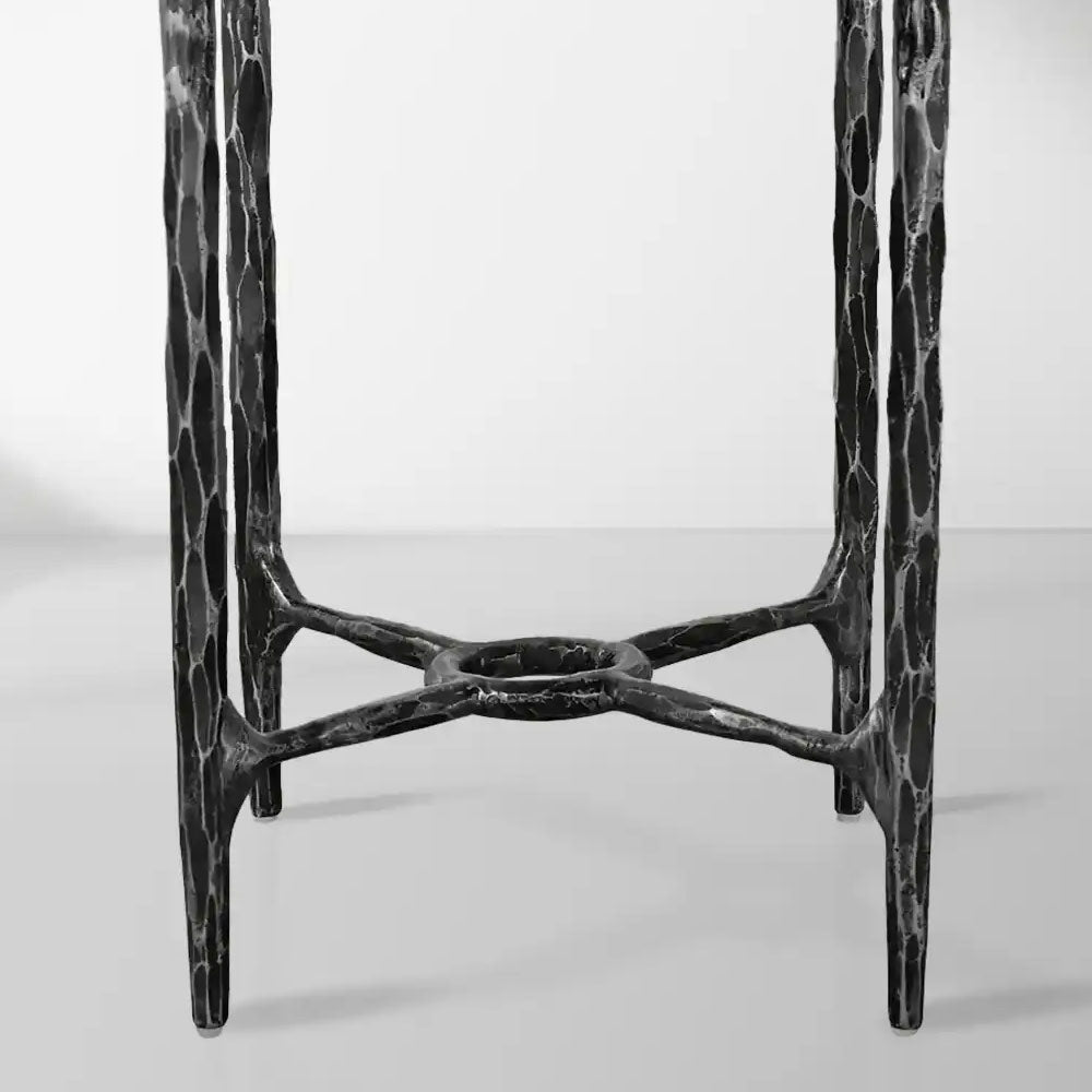 The base is hand-forged from solid metal, with each piece individually hammered to achieve a unique textured finish. This artisanal approach ensures that every table carries the mark of skilled craftsmanship.