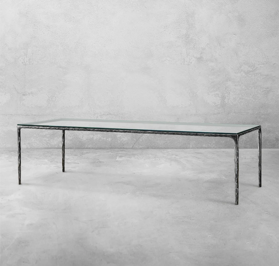 Crafted for those who appreciate distinctive design and superior artistry, the Thaddeus Rectangular Dining Table showcases a masterfully forged metal frame available in three refined finishes. The frame is meticulously hand-hammered, resulting in a unique texture that ensures no two tables are alike.