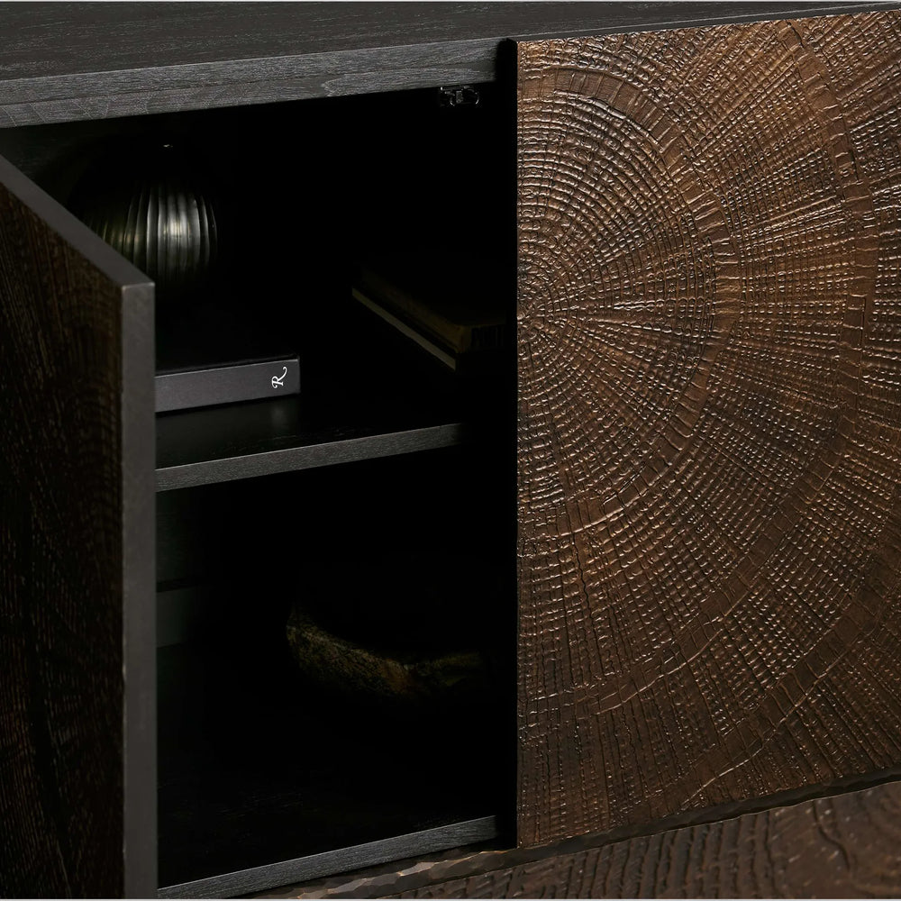 The Theota Sideboard is a celebration of organic artistry and handcrafted detail. Meticulously built in Indonesia from natural teak wood, its surface radiates with a stunning, hand-stamped sunburst pattern—created individually on each piece using traditional tools and mineral paste. Paired with hand-hammered aluminum legs, this sideboard blends rustic character with refined elegance, offering both striking visual presence and generous, thoughtful storage for your living or dining space.