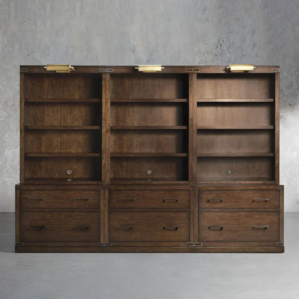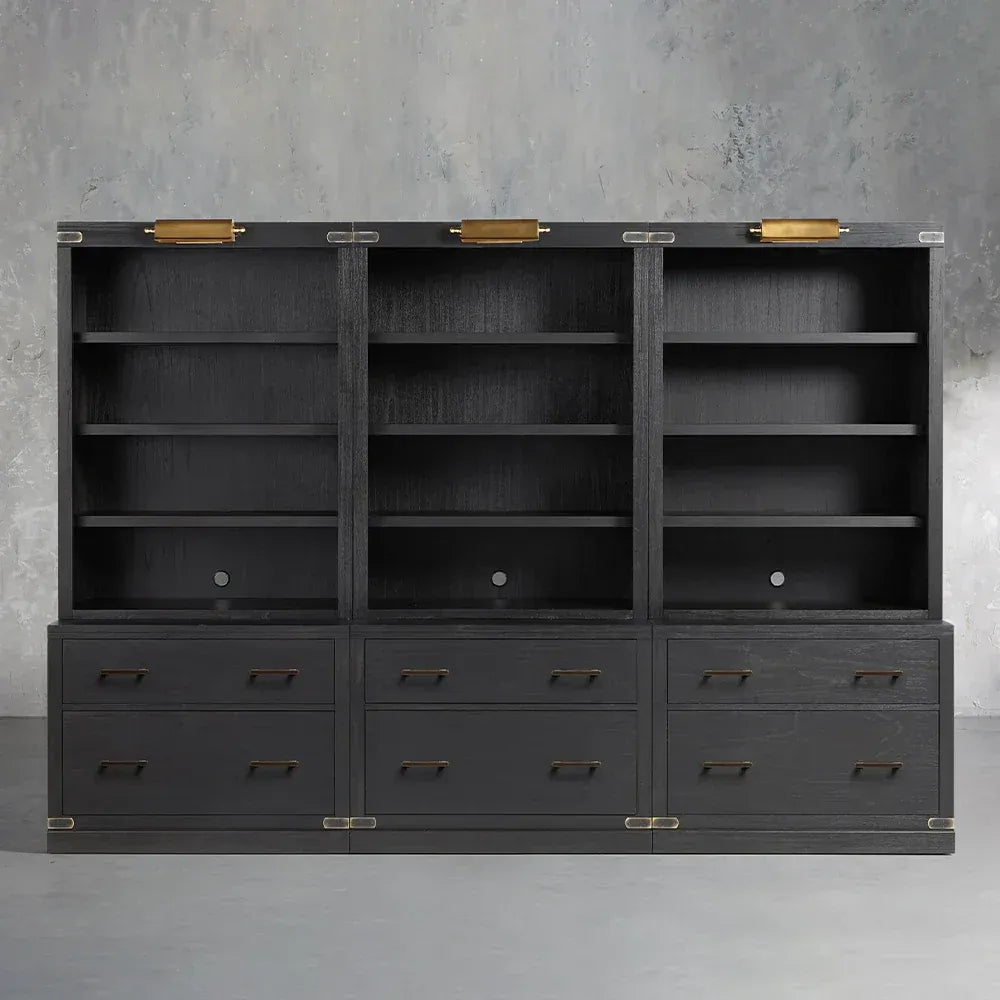 Inspired by 18th and 19th-century campaign furnishings—originally designed for portability and reassembly—the Tremont Modular Bookcase blends rugged durability with refined library aesthetics. Crafted from solid mindi wood and thick veneers, this collection features hand-applied, wire-brushed finishes that enhance the wood’s natural grain, complemented by antique brass hardware for timeless appeal. Choose between 40" and 120" widths to create a custom workspace, lounge, or home library from over 15 modular configurations.