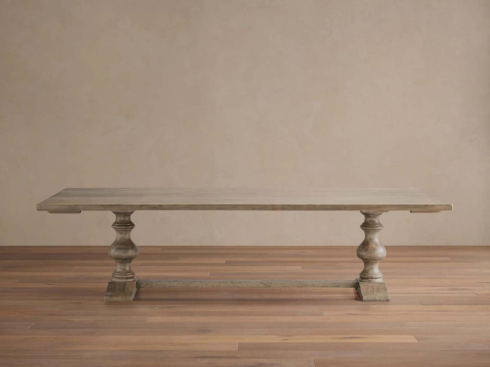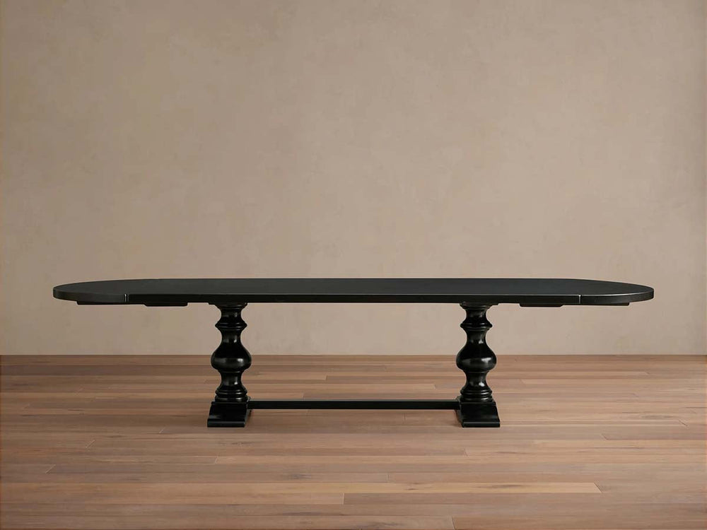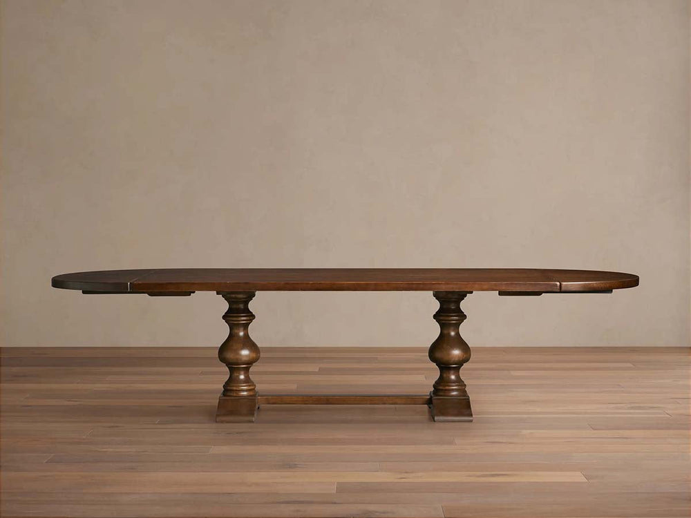 Embodying the romance of Italian craftsmanship, the Tuscany Oval Extension Dining Table is made to become the heart of your home. Meticulously handcrafted from solid poplar wood by Italian artisans, its warm grain and carefully distressed finish give each piece a unique, gently aged character. The elegantly turned pedestal legs, sculpted crown molding, and brass pharmacy-style handles evoke timeless tradition, while two 20″ leaves extend the table for larger gatherings—preserving both beauty and function.
